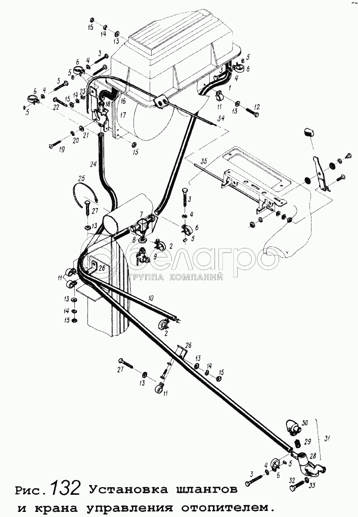 Каталог запасных частей к технике: МАЗ-64255. Установка шлангов и крана управления отопителем