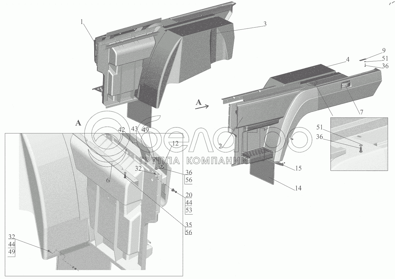 Каталог запасных частей к технике: МАЗ-643018. Установка оперения 6431-8400020-010