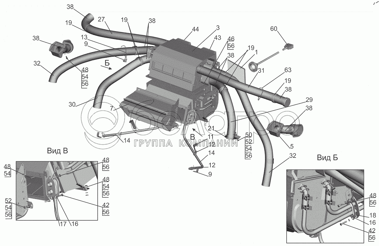 Каталог запасных частей к технике: МАЗ-643018. Установка отопителя 631019-8100001-010