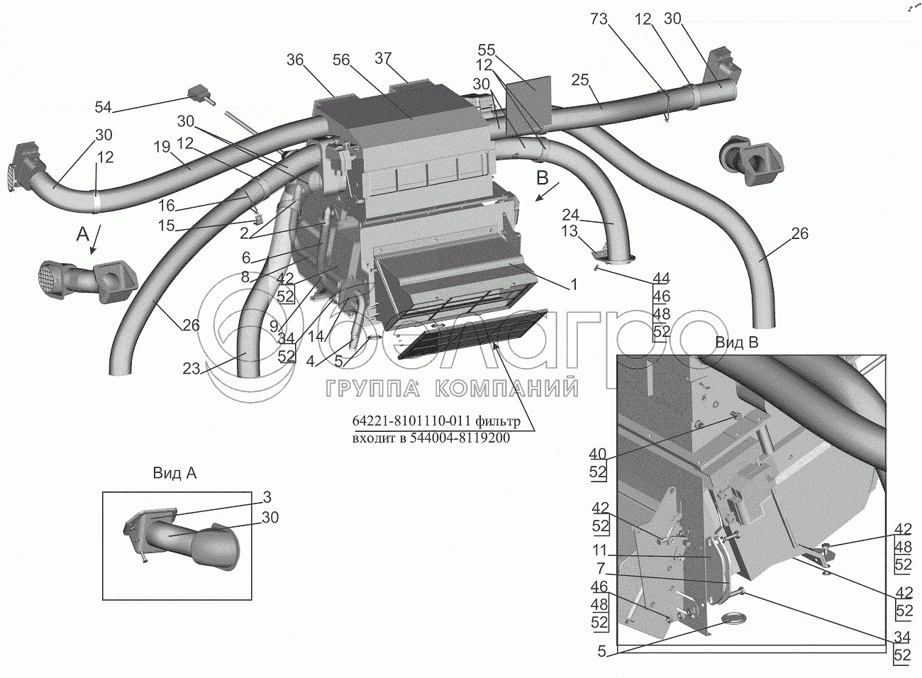 Каталог запасных частей к технике: МАЗ-643018. Установка отопителя 643008-8100001