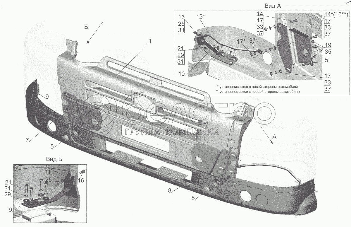 Каталог запасных частей к технике: МАЗ-643018. Установка переднего бампера 643019-2800003