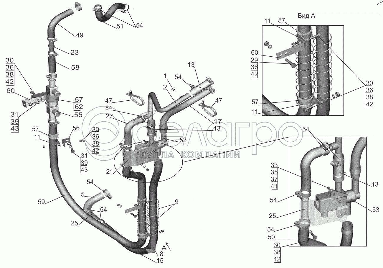Каталог запасных частей к технике: МАЗ-643018. Установка шлангов отопителя 544019-8100006-030