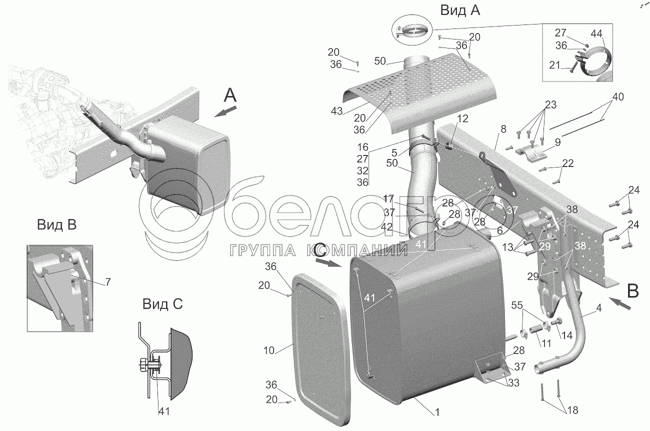 Каталог запасных частей к технике: МАЗ-643018. Установка системы выпуска газов 544018-1200001