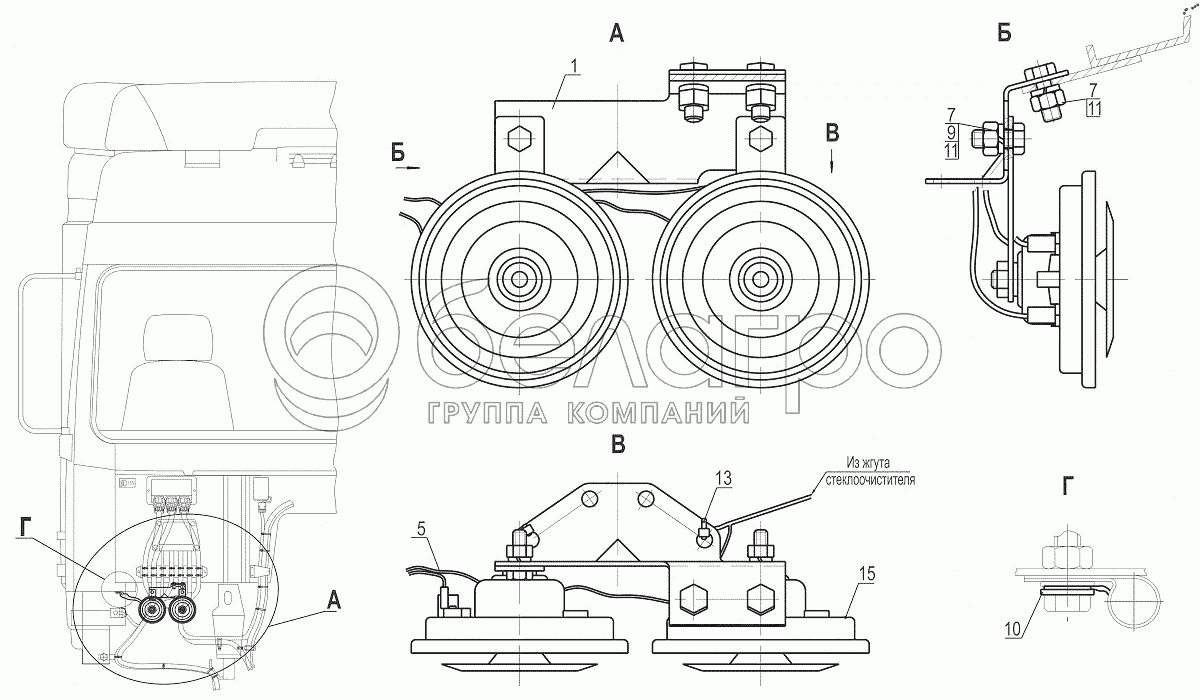 Каталог запасных частей к технике: МАЗ-643018. Установка звуковых сигналов 643008-3700024-000