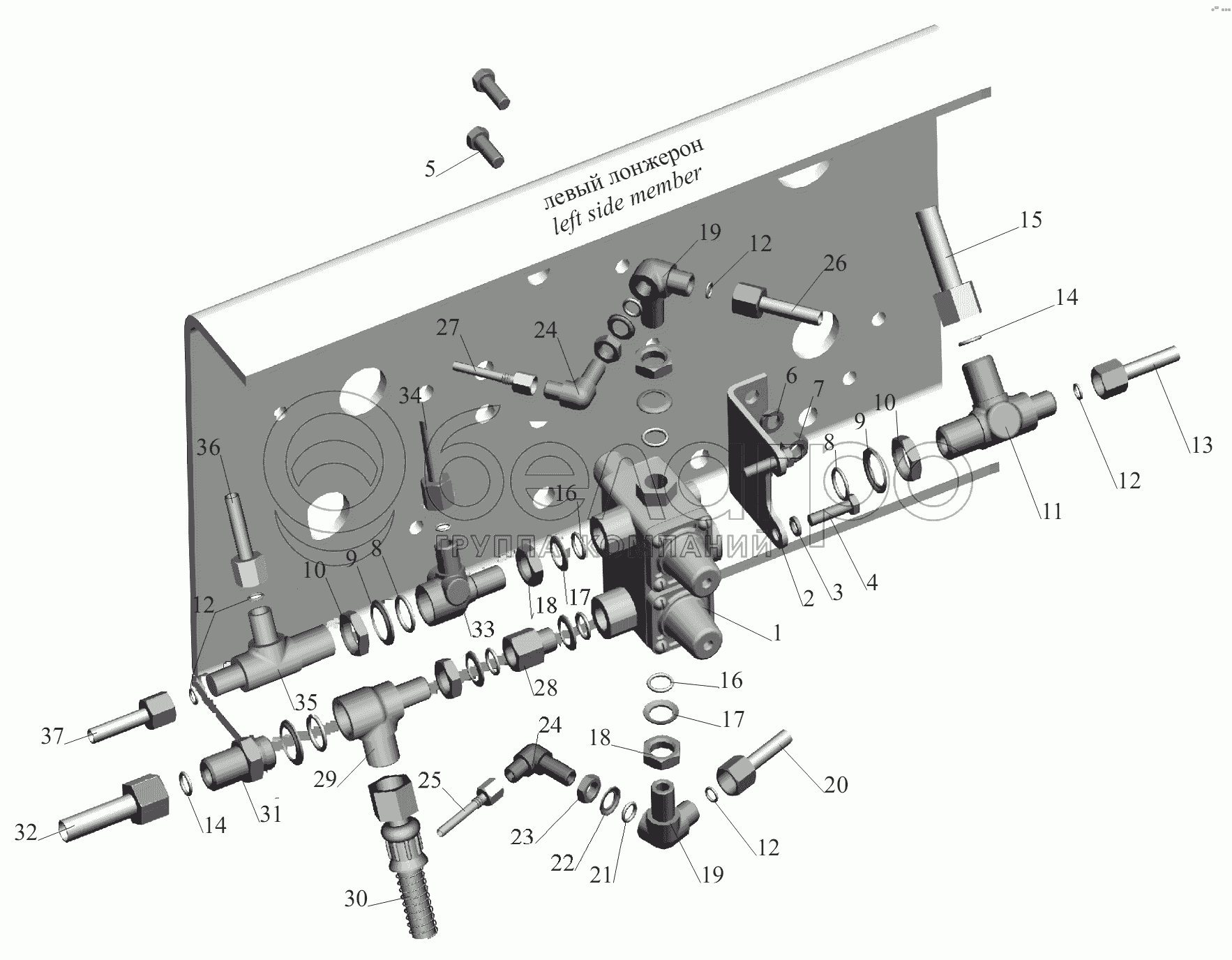 Каталог запасных частей к технике: МАЗ-6430A8 (5440A8, 5440A5). Крепление четырехконтурного клапана 544008-3515002