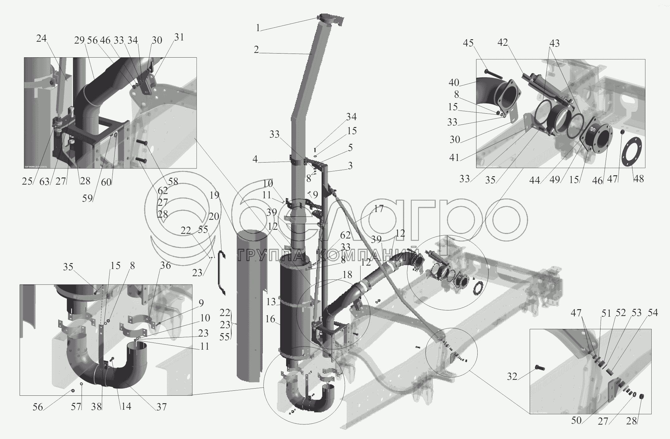 Каталог запасных частей к технике: МАЗ-6430A8 (5440A8, 5440A5). Установка системы выпуска 5440A8-1200001