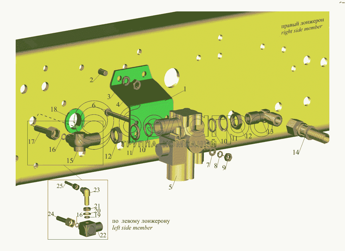 Каталог запасных частей к технике: МАЗ-650108. Установка передних модуляторов и присоединительной арматуры