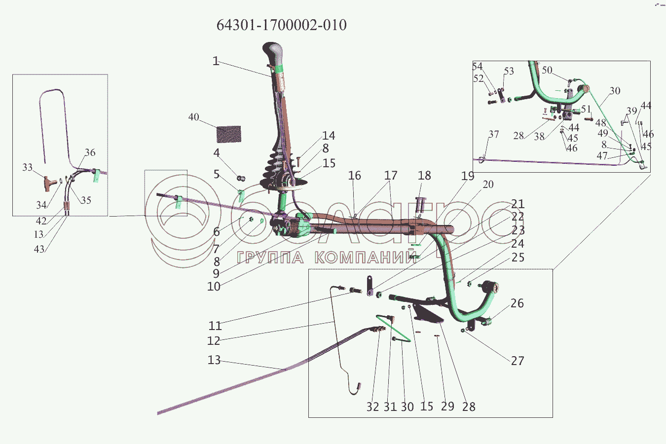 Каталог запасных частей к технике: МАЗ-650108. Установка привода управления коробкой передач