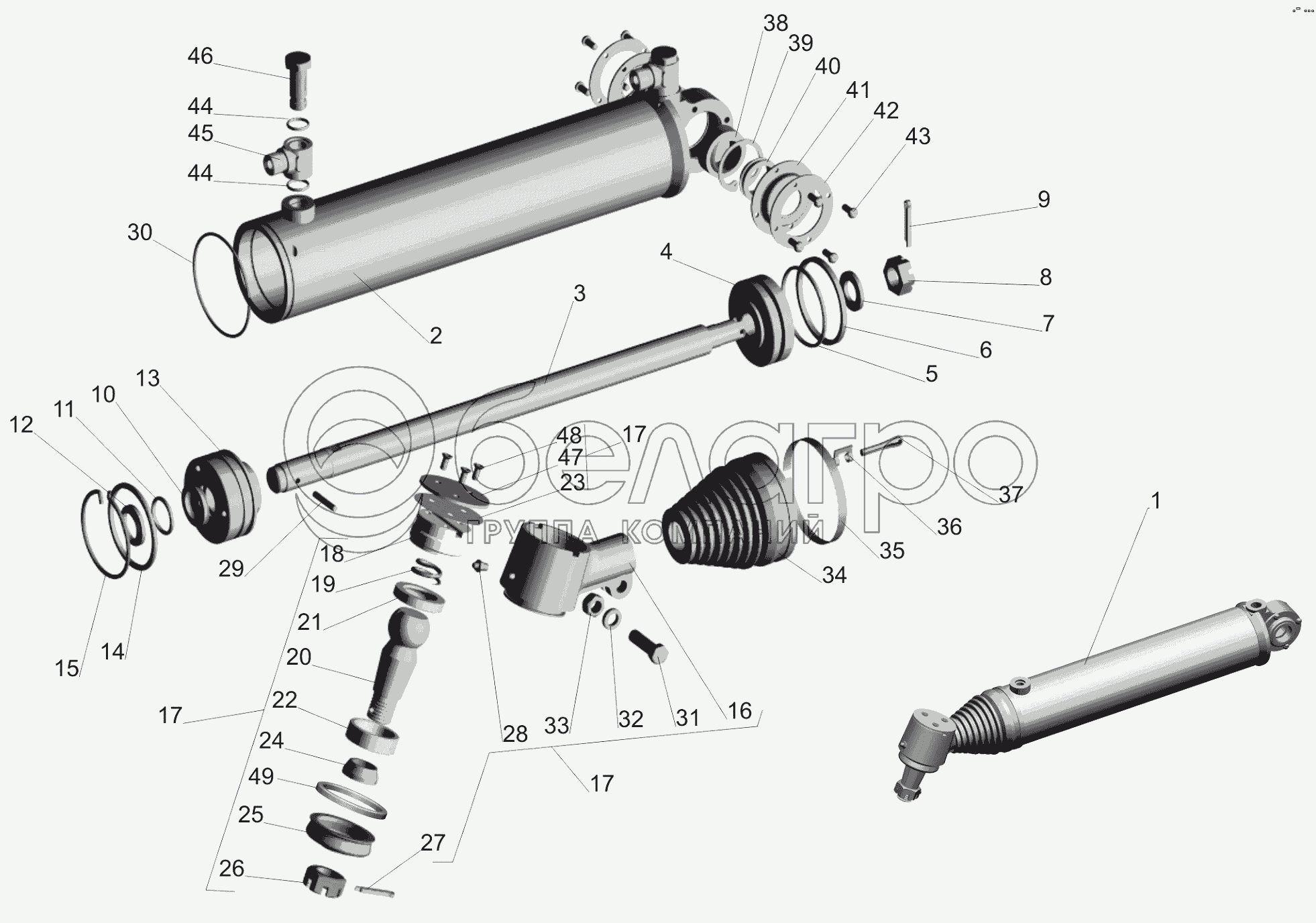 Каталог запасных частей к технике: МАЗ-650119. Силовой цилиндр гидроусилителя рулевого управления 64221-3405004