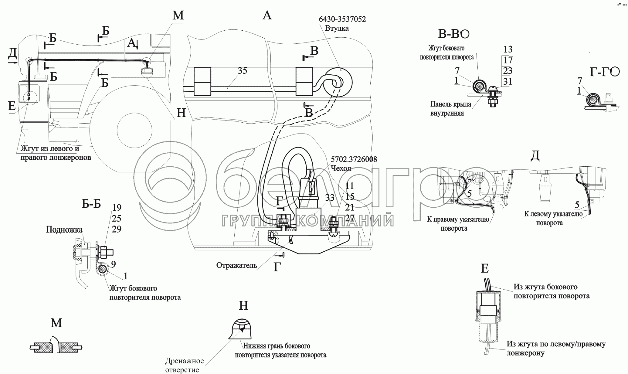 Каталог запасных частей к технике: МАЗ-650119. Установка боковых указателей поворота 6430-3700150