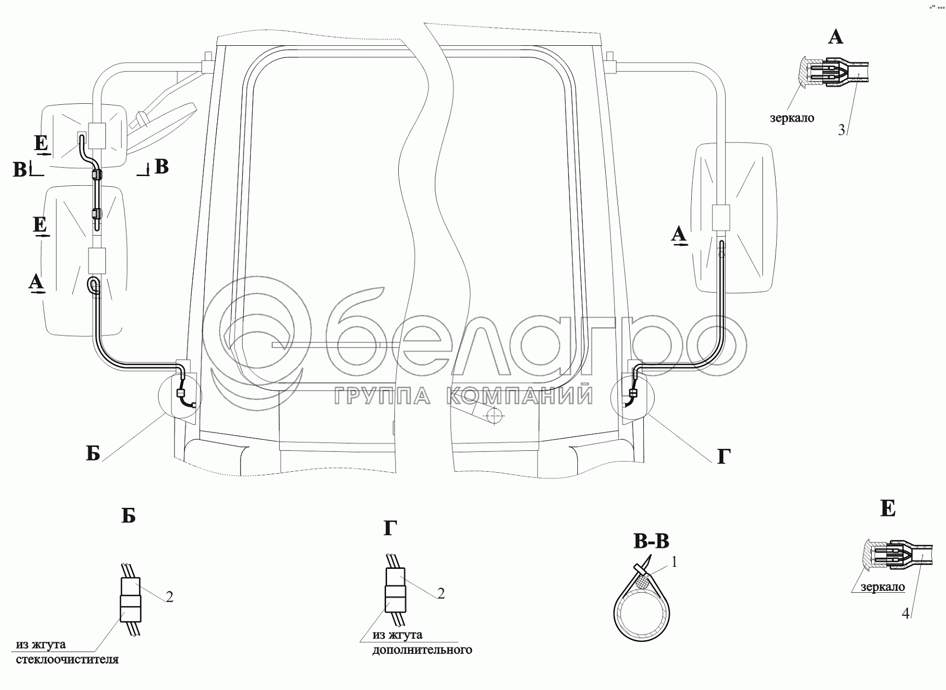 Каталог запасных частей к технике: МАЗ-650119. Установка кабелей обогрева зеркал 6430-3700108