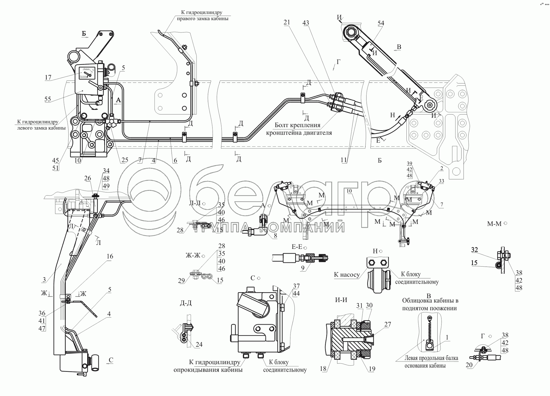 Каталог запасных частей к технике: МАЗ-650119. Установка механизма подъема кабины 650119-5000040-010