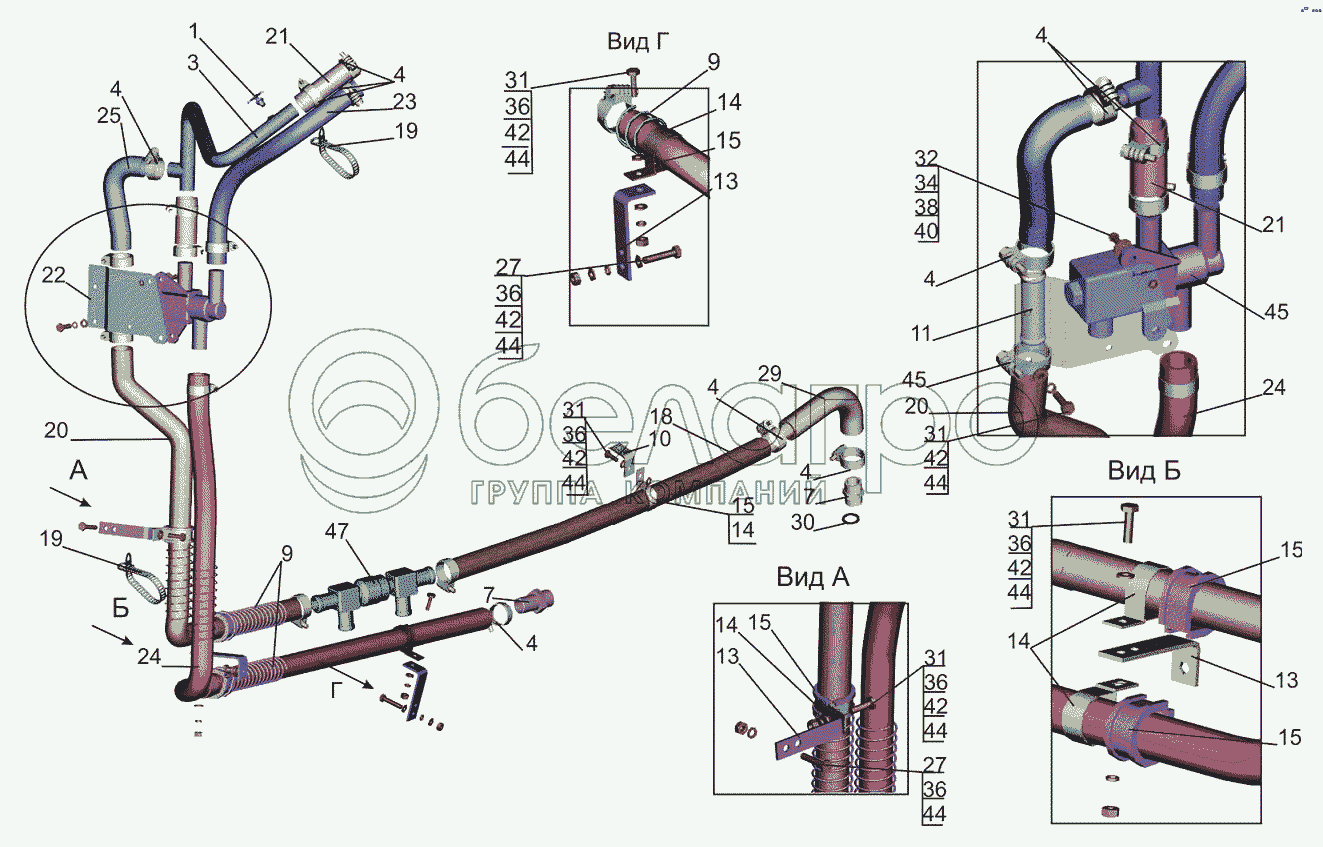 Каталог запасных частей к технике: МАЗ-6501B9. Установка шлангов отопителя 6516A9-8100006-030