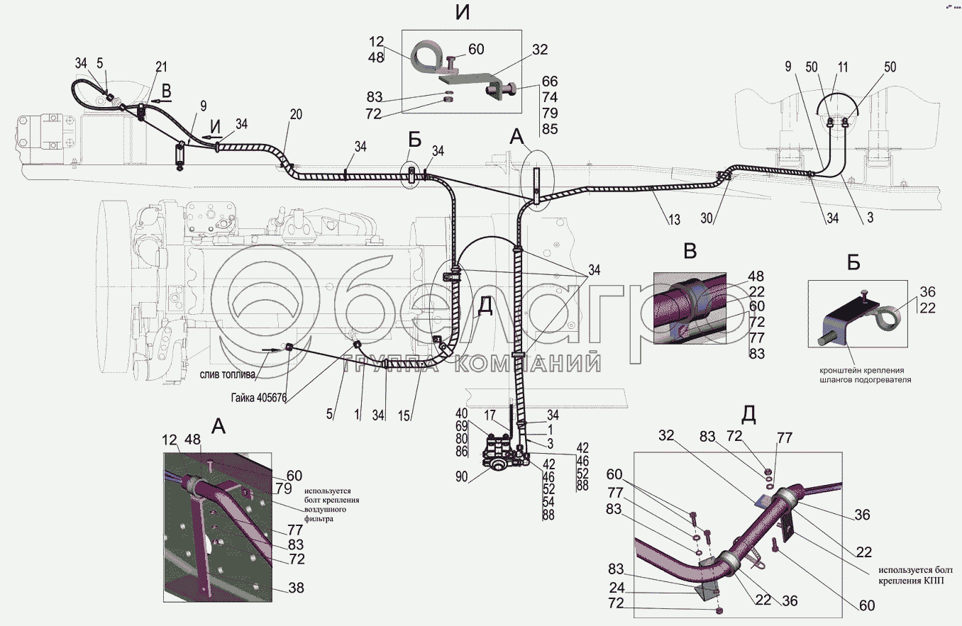 Каталог запасных частей к технике: МАЗ-6501B9. Установка топливопроводов 6501B9-1104002-020