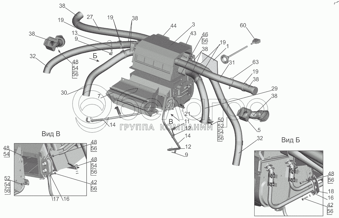 Каталог запасных частей к технике: МАЗ-6501B9. Установка отопителя 631019-8100001-010