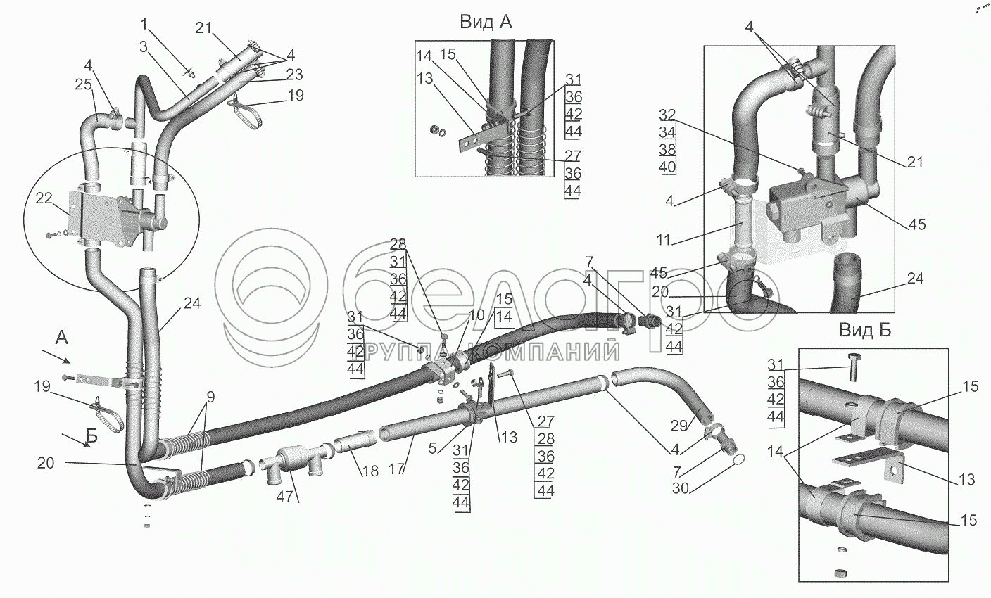 Каталог запасных частей к технике: МАЗ-6501B9. Установка шлангов отопителя 6501B9-8100006-030