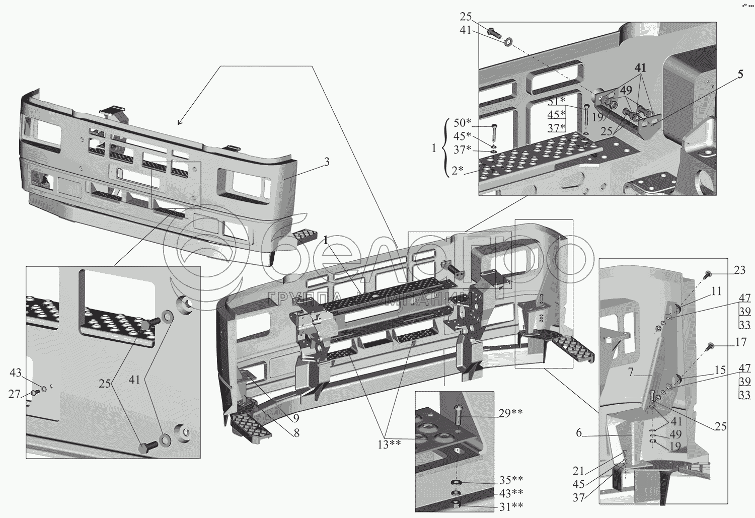 Каталог запасных частей к технике: МАЗ-651669-320 (340). Установка бампера 651608-2803006-011