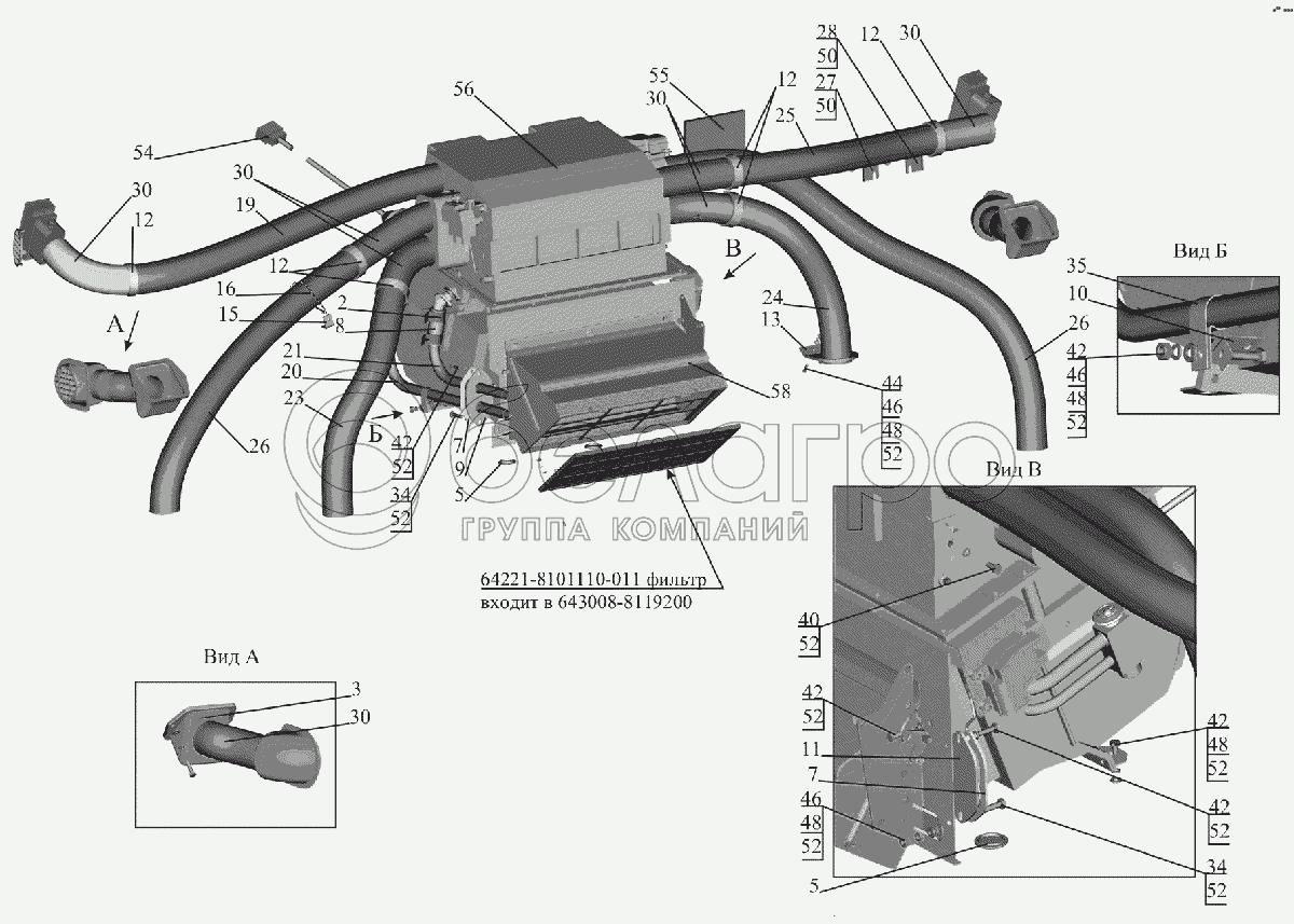 Каталог запасных частей к технике: МАЗ-6516V8-520 (6516V8-540). Установка отопителя 631019-8100001