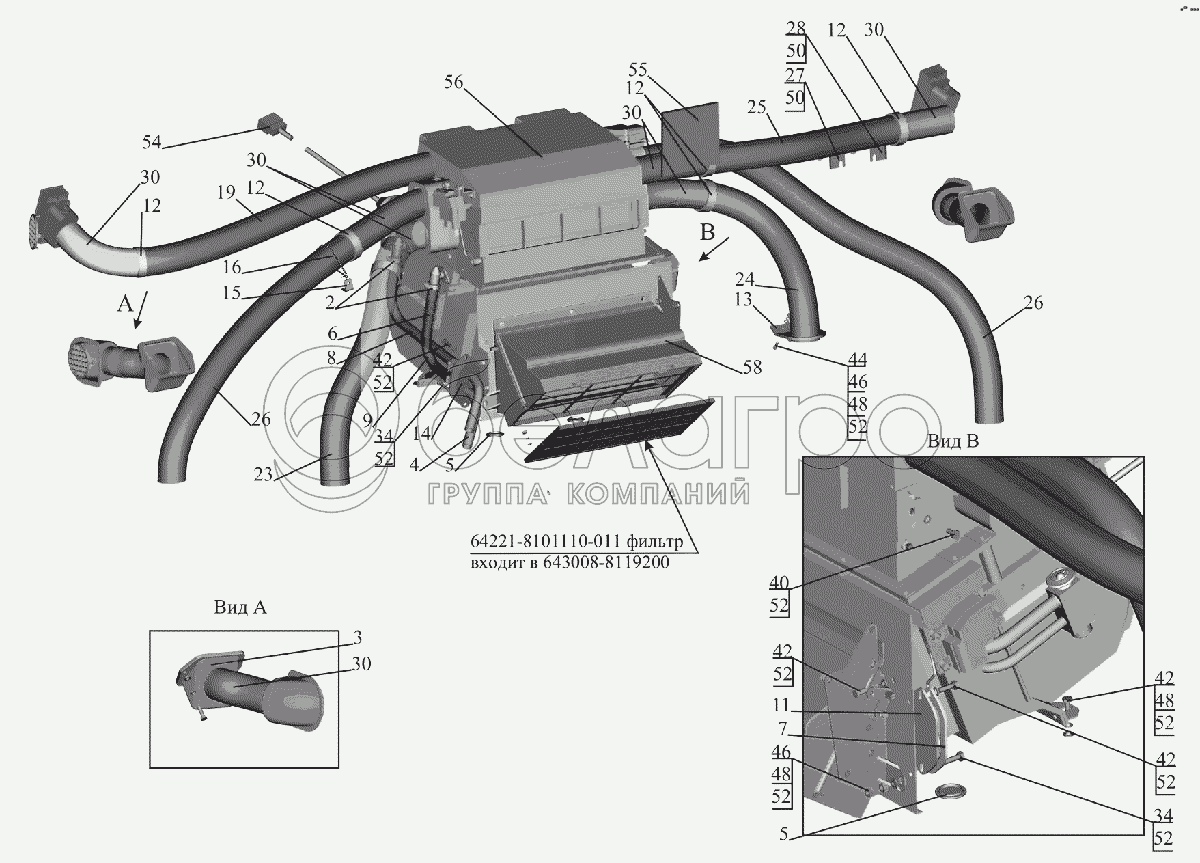 Каталог запасных частей к технике: МАЗ-6516V8-520 (6516V8-540). Установка отопителя 643008-8100001