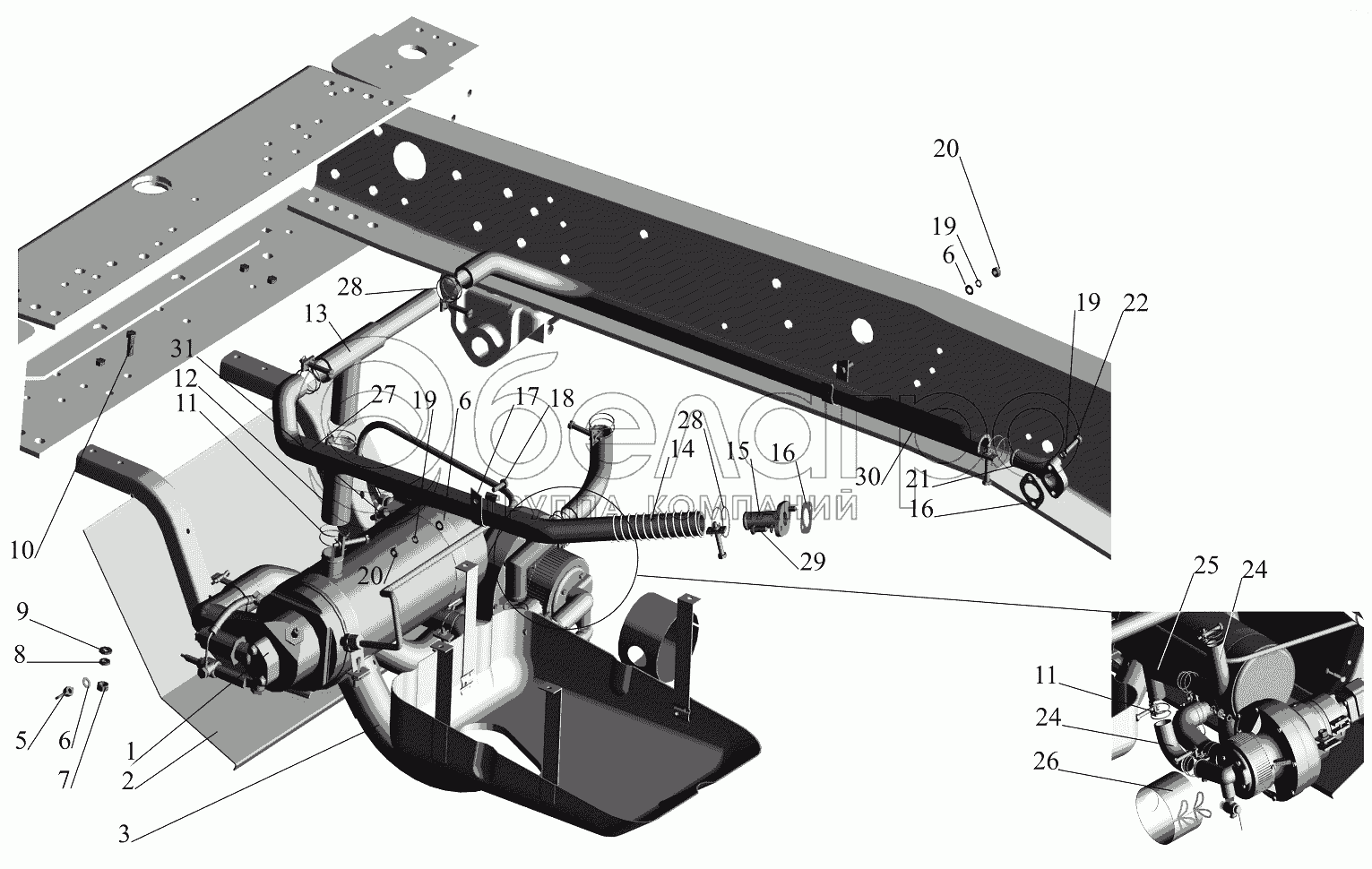 Каталог запасных частей к технике: МАЗ-651705. Крепление предпускового подогревателя 642290-1015001