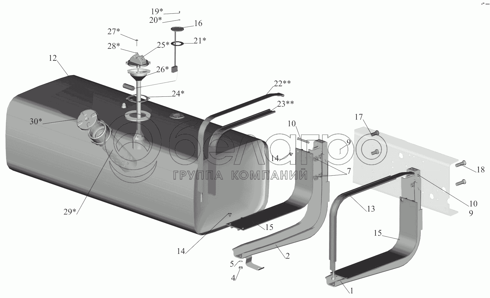 Каталог запасных частей к технике: МАЗ-651705. Крепление топливного бака 651705-1101002-100