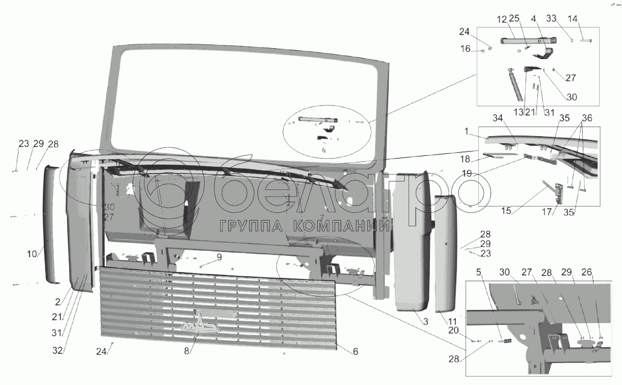 Каталог запасных частей к технике: МАЗ-651705. Установка облицовки передка 64221-8400018