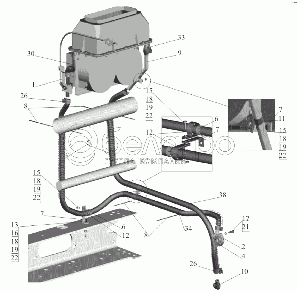 Каталог запасных частей к технике: МАЗ-651705. Установка шлангов отопителя 54327-8100006