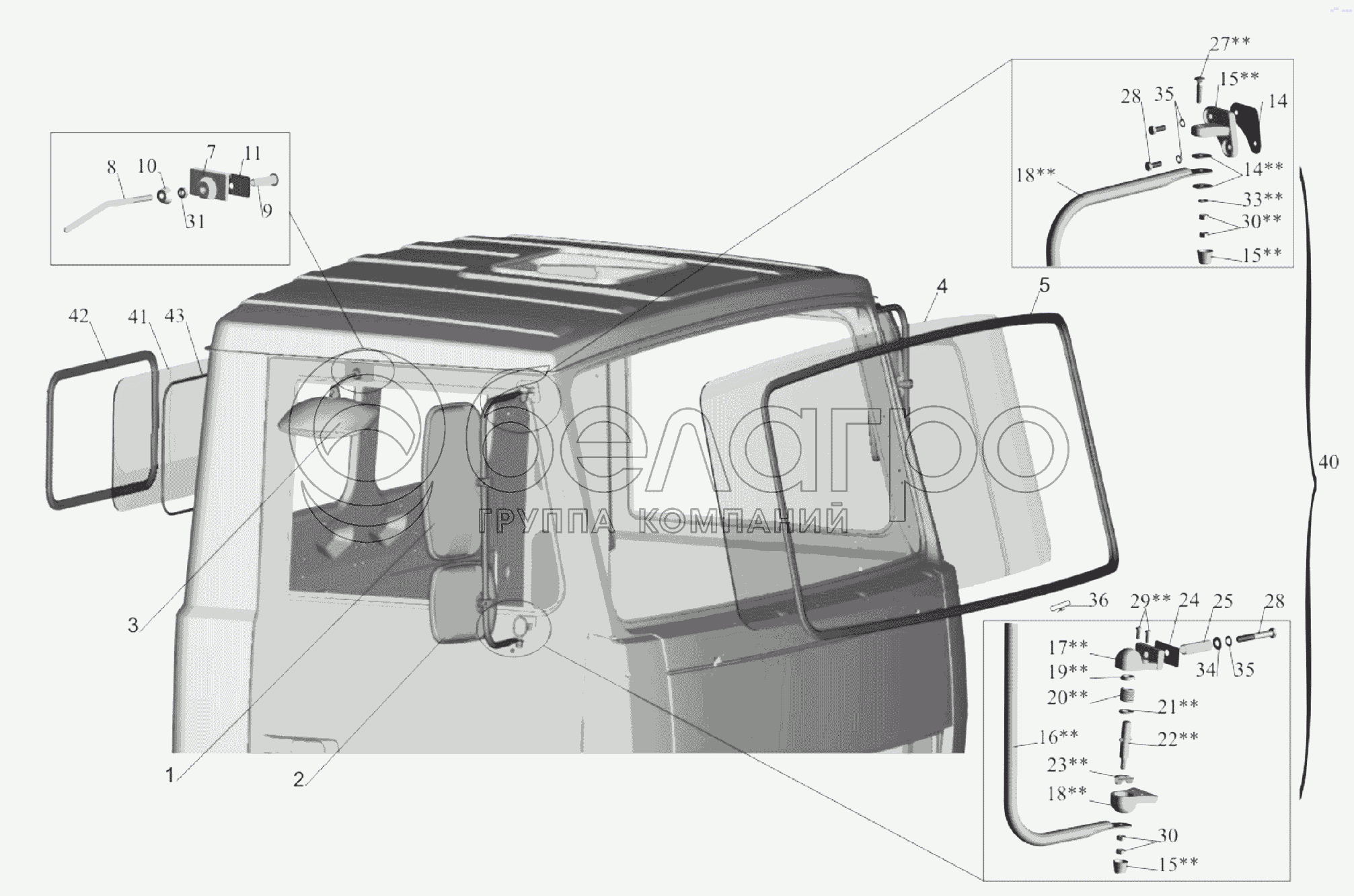 Каталог запасных частей к технике: МАЗ-651705. Установка стекла ветрового, зеркал, зеркалодержателей, стекол задних
