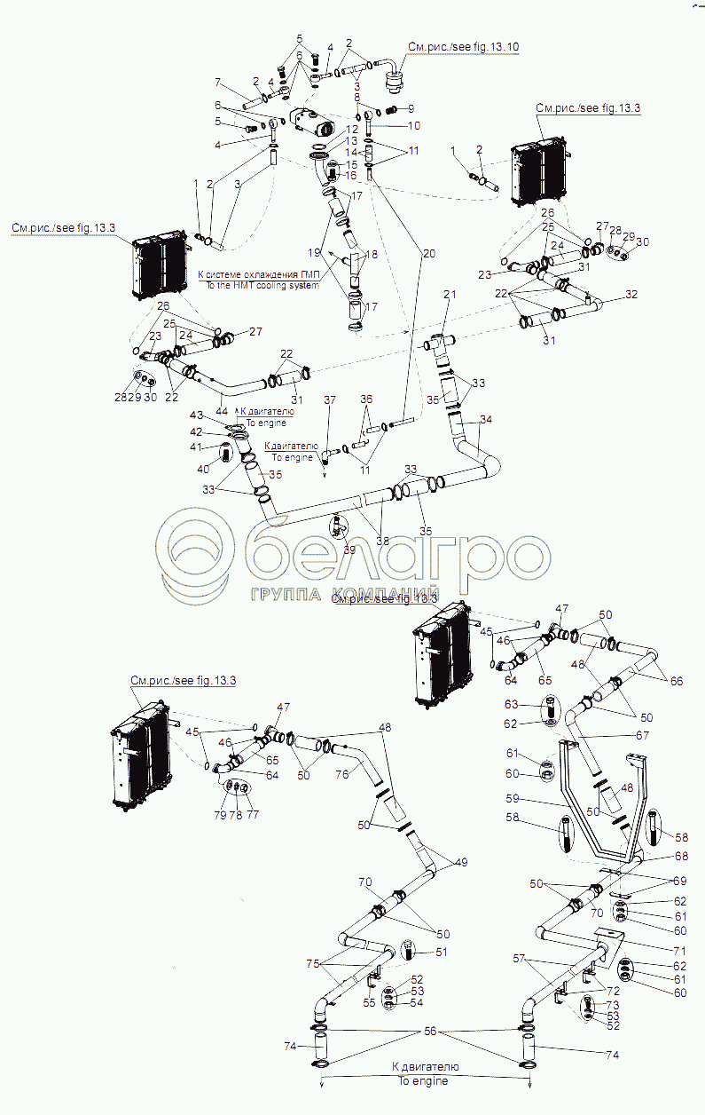 Каталог запасных частей к технике: МАЗ-74131. Установка трубопроводов системы охлаждения двигателя