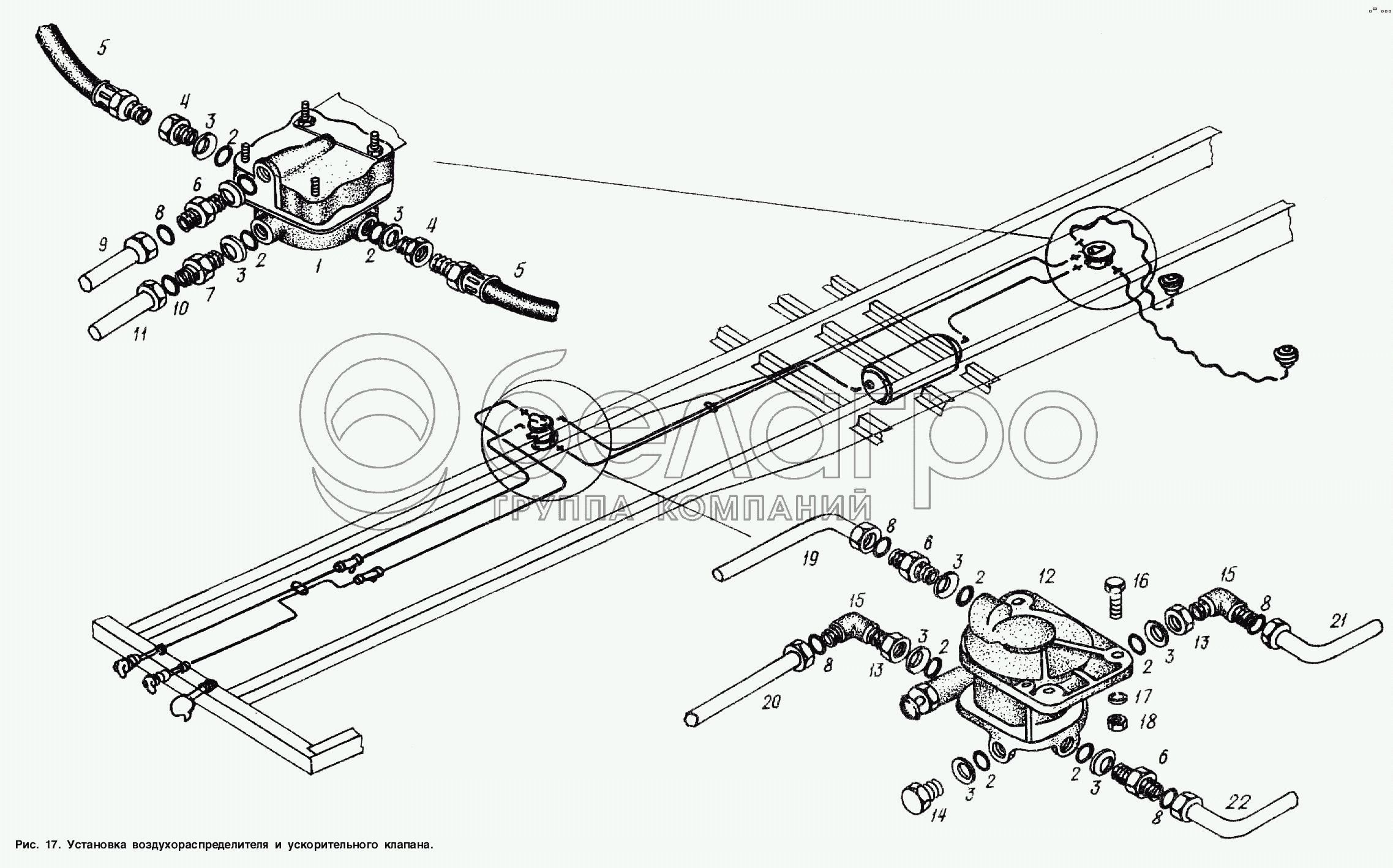 Каталог запасных частей к технике: МАЗ-93802. Установка воздухораспределителя и ускорительного клапана