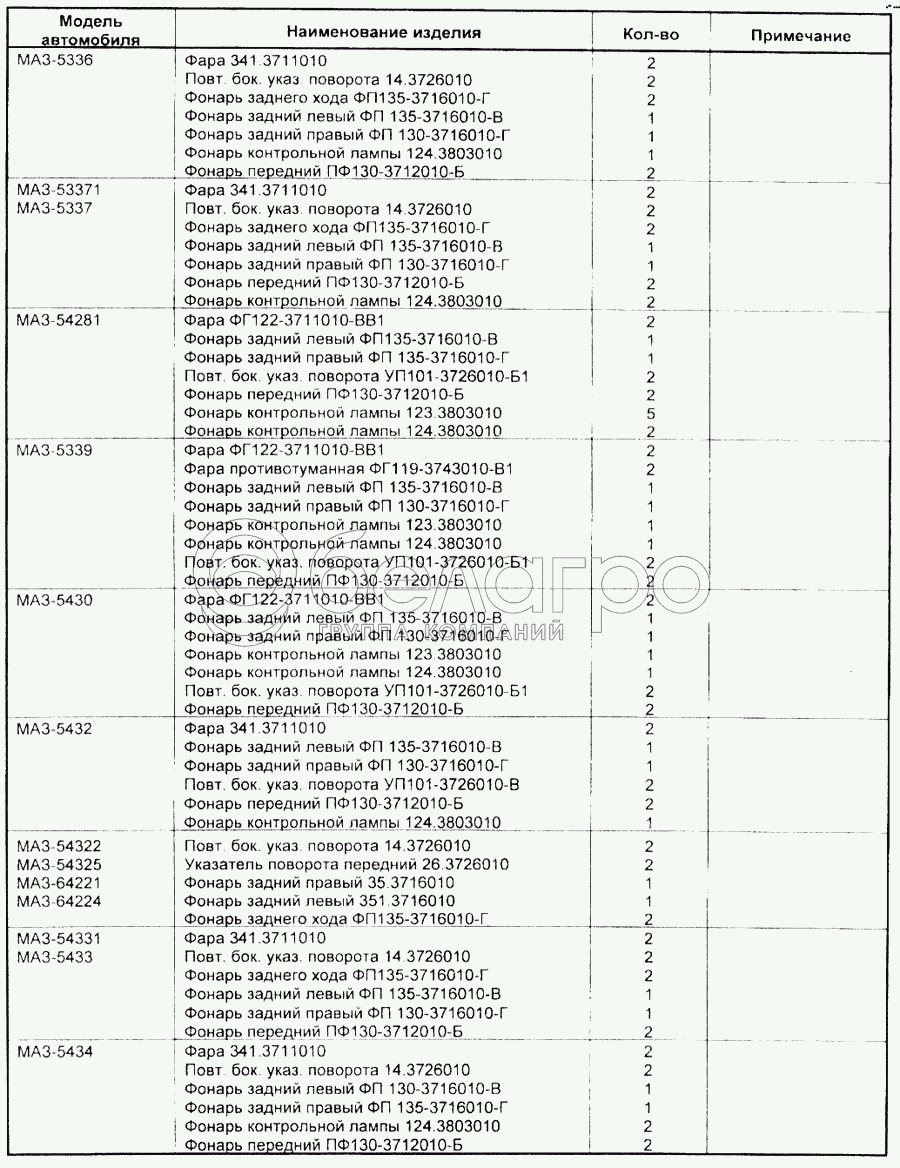 Каталог запасных частей к технике: МАЗ Справочник. Фонари и фары автомобилей МАЗ
