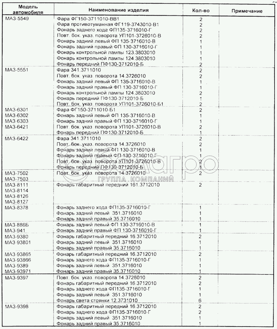 Каталог запасных частей к технике: МАЗ Справочник. Фонари и фары автомобилей МАЗ