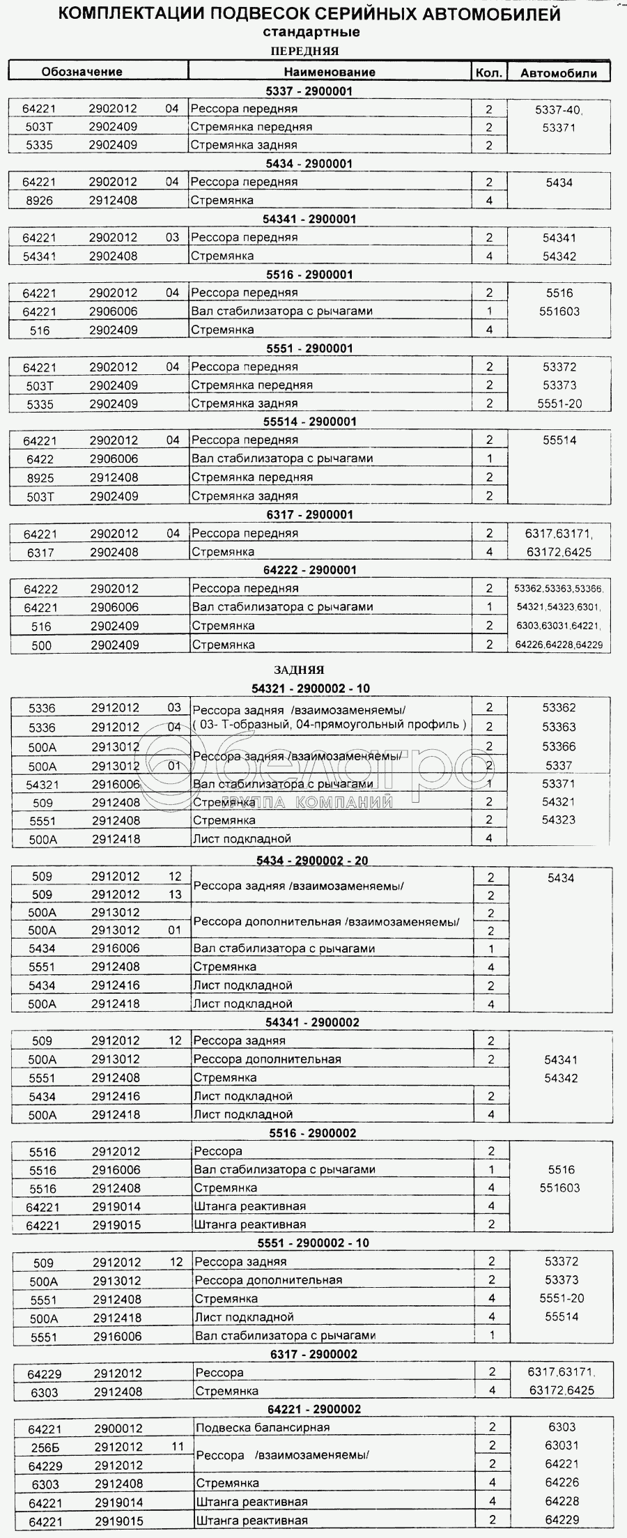 Каталог запасных частей к технике: МАЗ Справочник. Комплектации подвесок серийных автомобилей (стандартные)