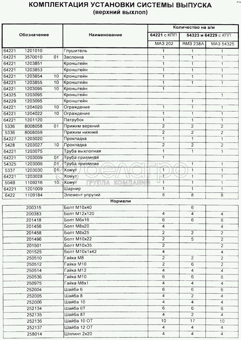 Каталог запасных частей к технике: МАЗ Справочник. Комплектация установки системы выпуска (верхний выхлоп)