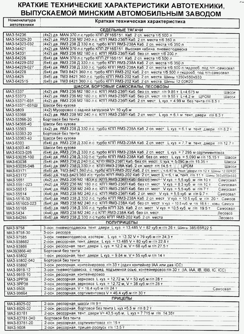 Каталог запасных частей к технике: МАЗ Справочник. Краткие технические характеристики автотехники, выпускаемой Минским Автомобильным Заводом