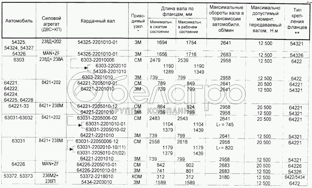 Каталог запасных частей к технике: МАЗ Справочник. Таблица применяемости карданных валов автомобилей МАЗ