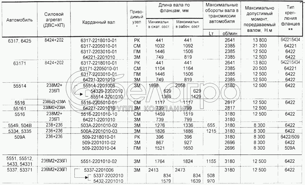 Каталог запасных частей к технике: МАЗ Справочник. Таблица применяемости карданных валов автомобилей МАЗ