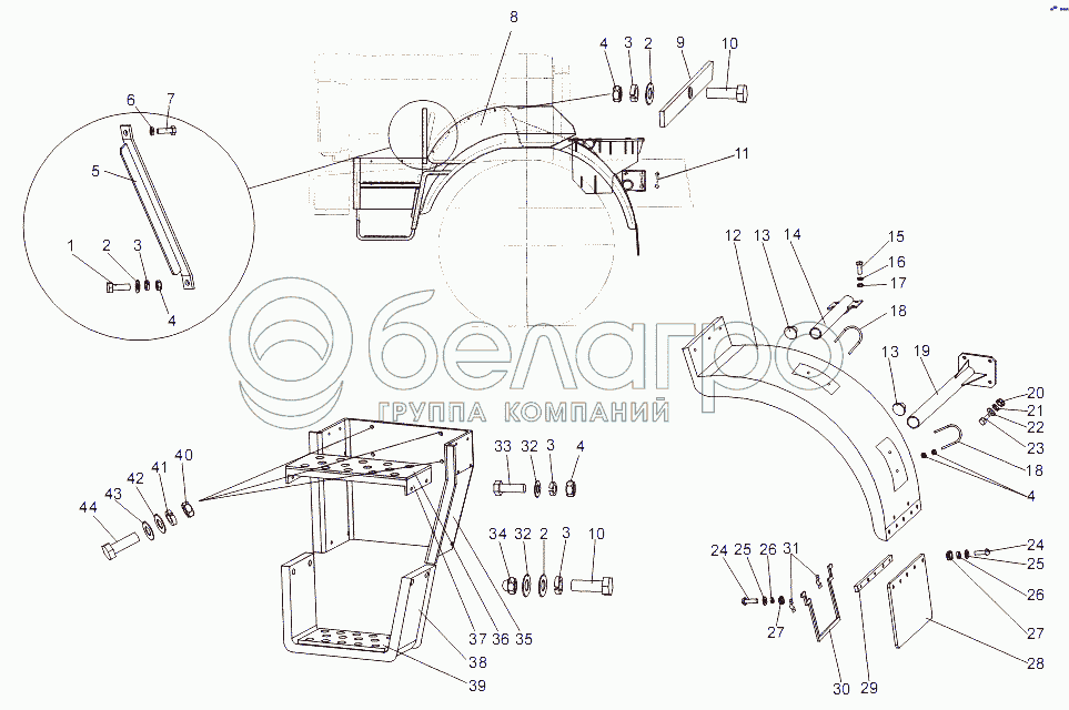 Каталог запасных частей к технике: МЗКТ-65151 "Волат". Установка подножек
