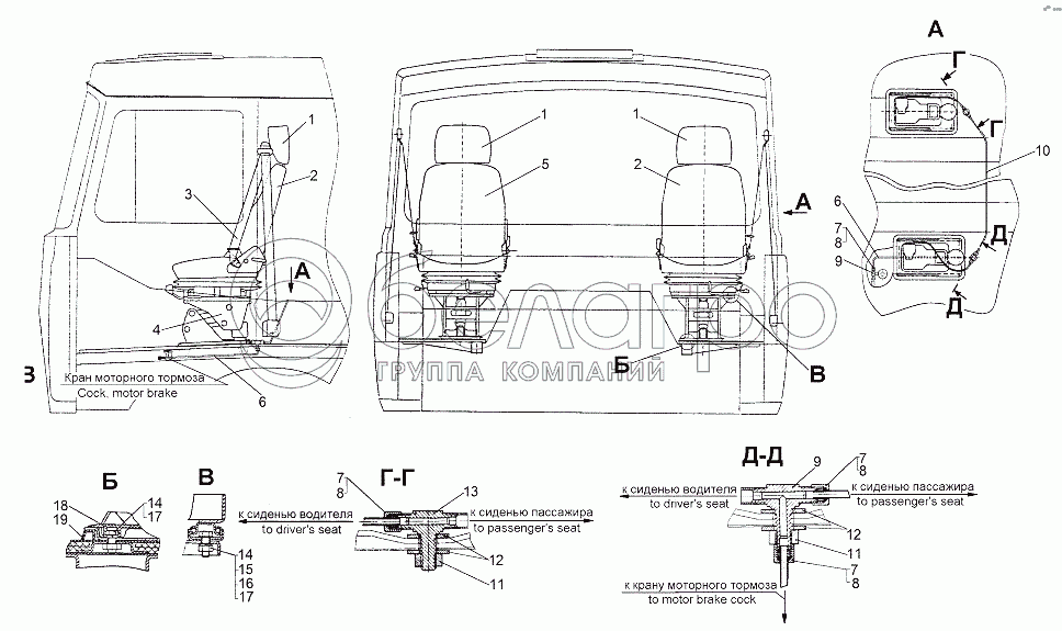 Каталог запасных частей к технике: МЗКТ-65151 "Волат". Установка сидений (Пневмоподвеска сидений МАЗ)