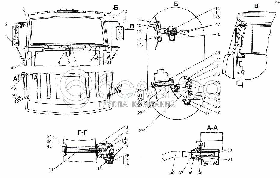 Каталог запасных частей к технике: МЗКТ-65151 "Волат". Установка зеркал, стеклоочистителя и омывателя