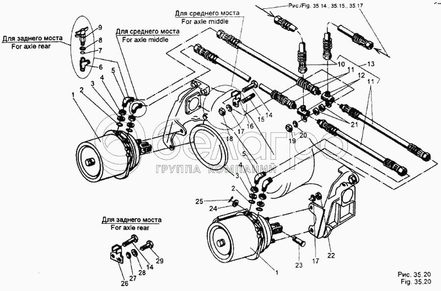 Каталог запасных частей к технике: МЗКТ-65158. Крепление задних тормозных камер и шлангов