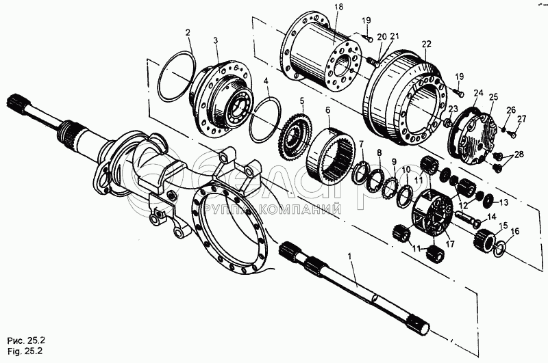 Каталог запасных частей к технике: МЗКТ-65158. Мост средний. Детали колесной передачи