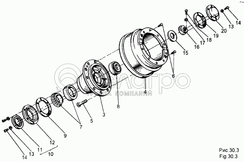 Каталог запасных частей к технике: МЗКТ-65158. Ступица с барабаном и подшипниками 6923-3103006