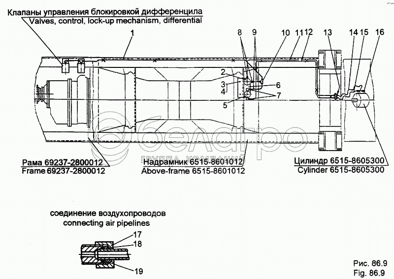 Каталог запасных частей к технике: МЗКТ-65158. Установка трубопроводов системы управления