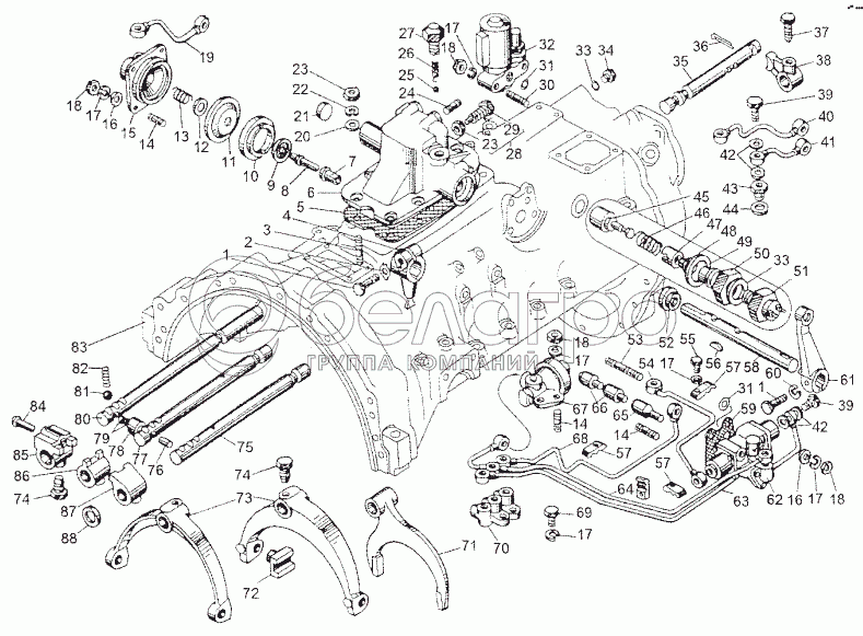 Каталог запасных частей к технике: МЗКТ-652511. Механизм переключения передач и опора рычага