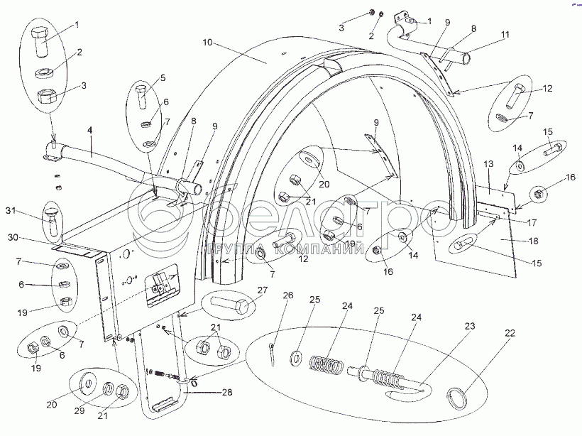 Каталог запасных частей к технике: МЗКТ-652511. Установка передних крыльев