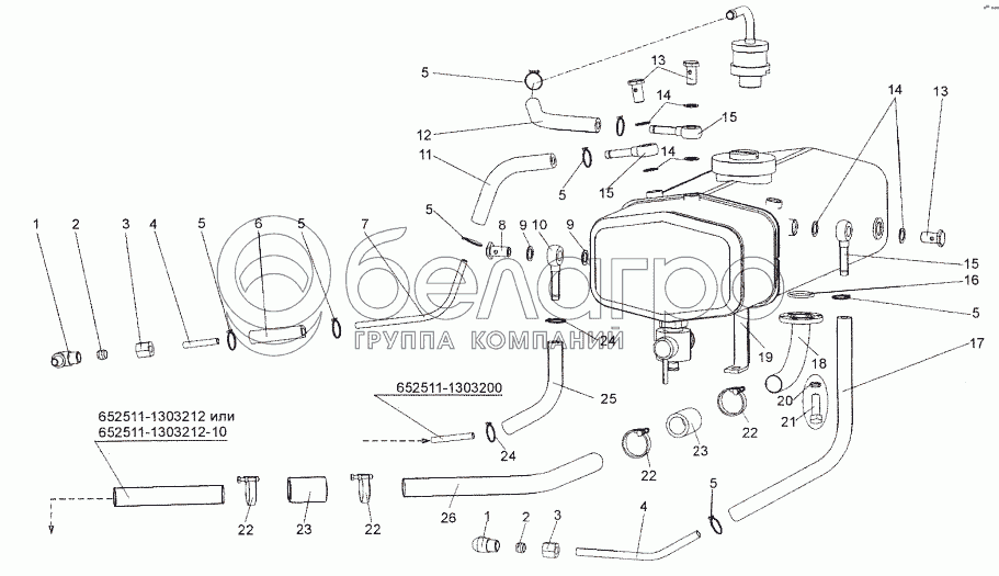 Каталог запасных частей к технике: МЗКТ-652511. Установка трубопроводов бачка расширительного