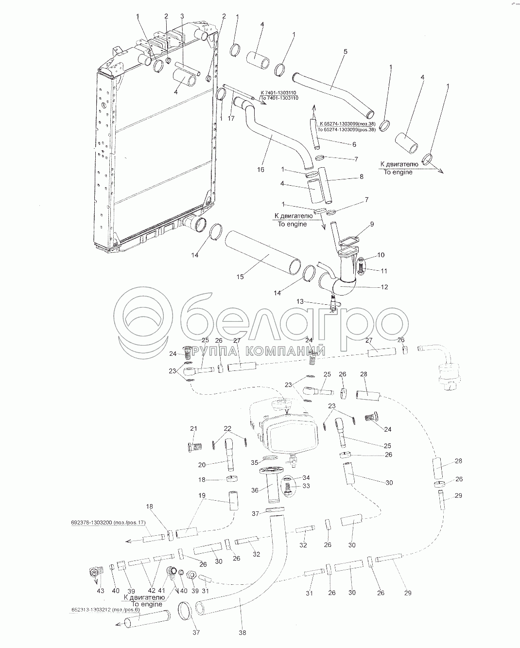 Каталог запасных частей к технике: МЗКТ-6527. Установка трубопроводов системы охлаждения двигателя