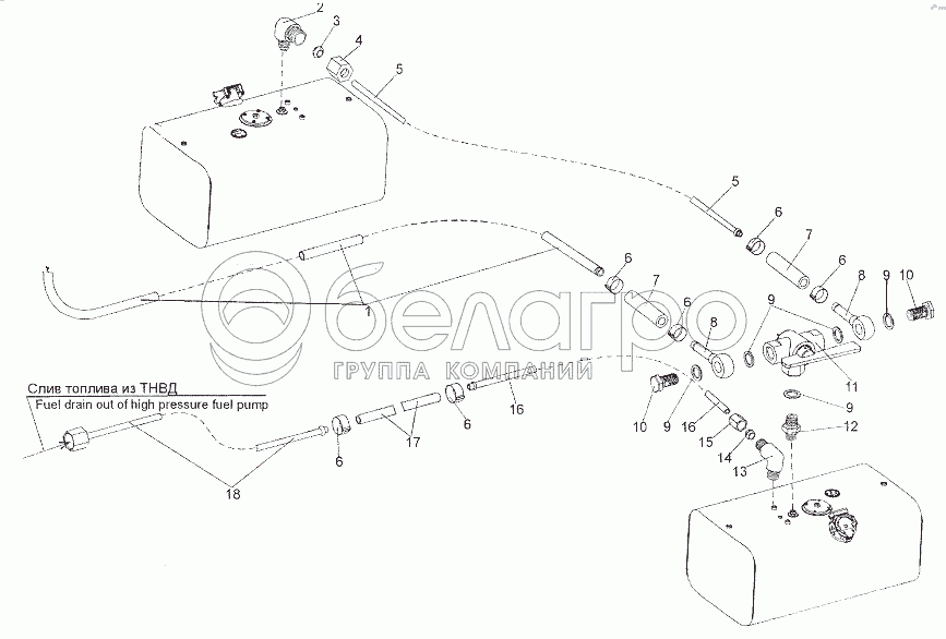 Каталог запасных частей к технике: МЗКТ-7401. Слив топлива из форсунок и ТНВД