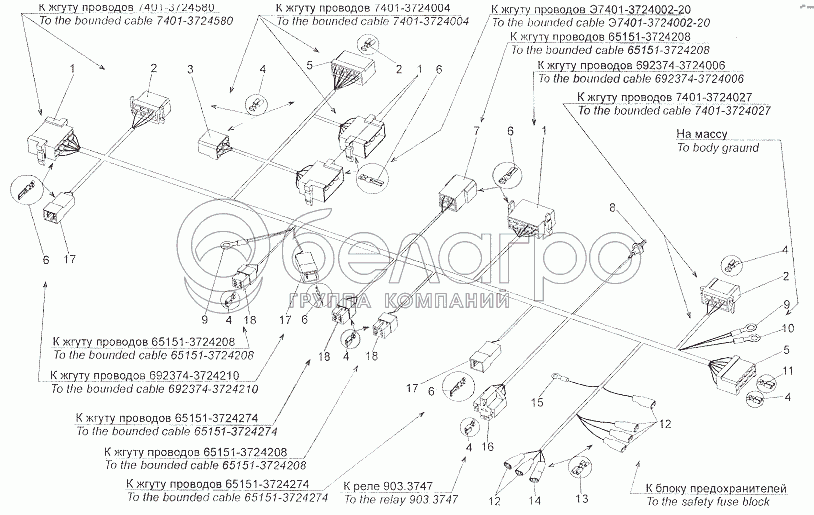 Каталог запасных частей к технике: МЗКТ-7401. Жгут проводов N2 в кабине 7401-3724206